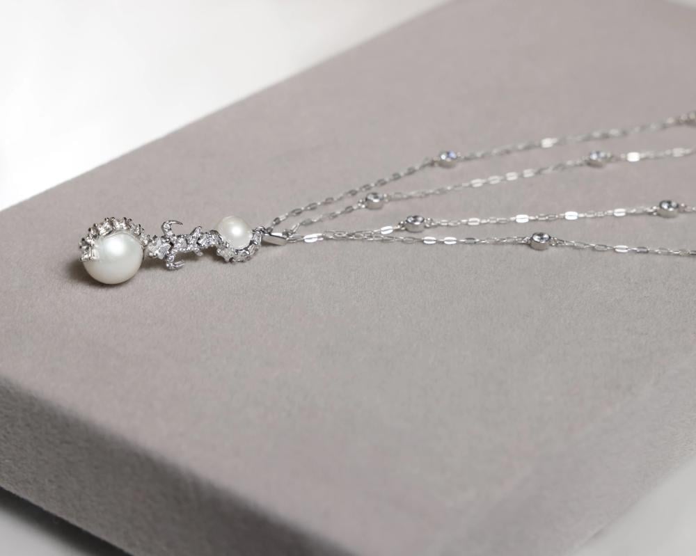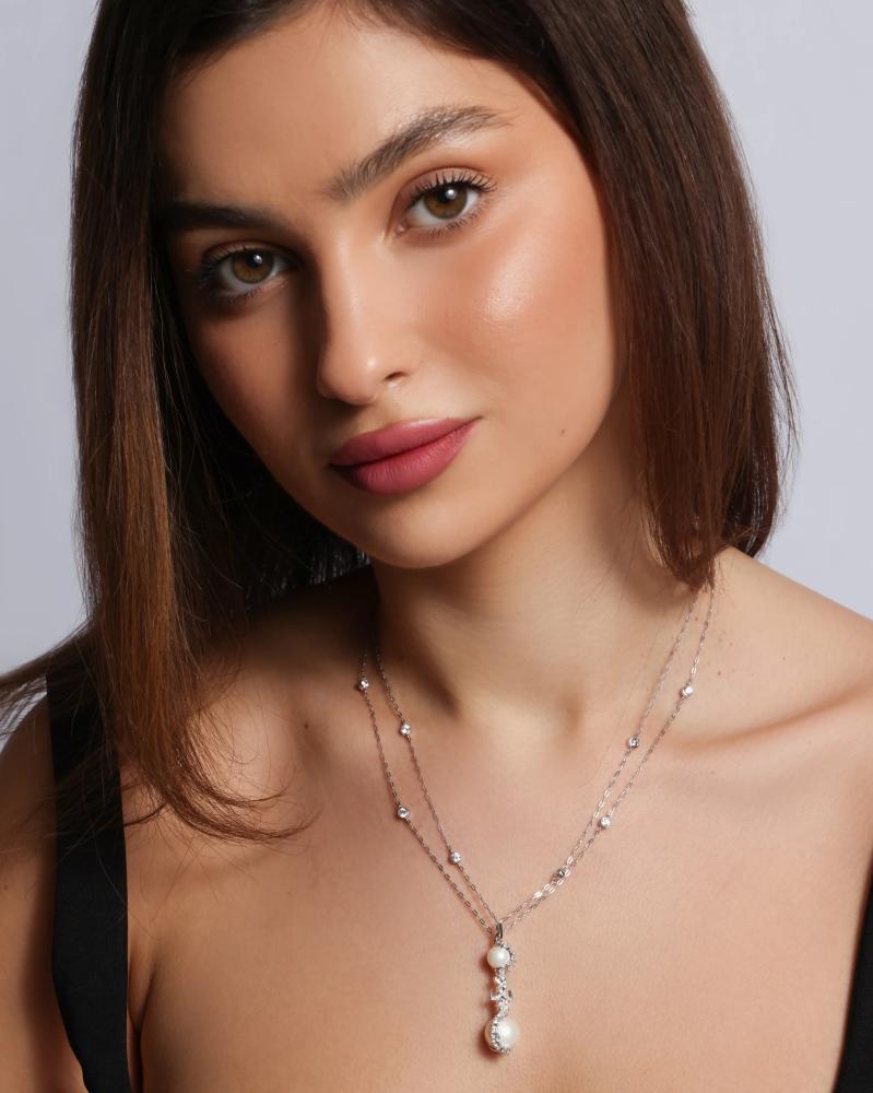 - تصنع القلادة من الذهب الأبيض الفاخر، مما يضفي عليها لمسة من النعومة واللمعان، بينما يتم استخدام اللؤلؤ الزراعي عالي الجودة الذي يضفي عليها مظهرًا فاخرًا وطبيعيًا.
